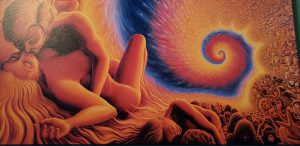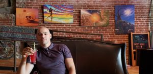 I immediately love the vibe in here, it’s much closer to the CBD culture I was looking for: the walls are plastered with psychedelic paintings, lots of tie-dye colors, a Pacific Island-style bar, and plenty of cozy furniture. Unlike a normal bar where parties split off into different tables, the seating is communal-style, with plush chairs and benches oriented around circular tables like a fireside. It’s the kind of place designed to break down barriers, both within you and outside you: sip on mellowing drinks and ease into conversation with a stranger.